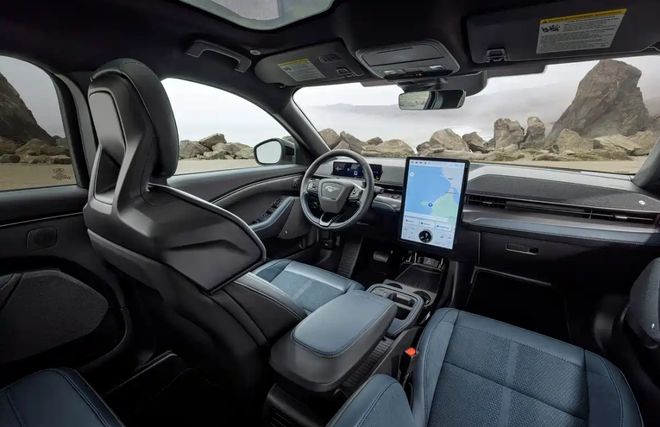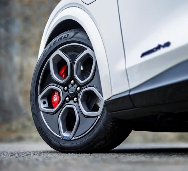 新车配备了独特的20英寸轮毂,配以黑色空气动力学轮罩,轮圈上清晰可见GT/CS标识——这是California Special的缩写。打开车门,你会看到Mach-E 4的蓝色标识,而车尾的GT徽章内也藏着California Special的字样。就连刹车系统都经过精心搭配,醒目的Brembo卡钳暗示着它不凡的性能基因。